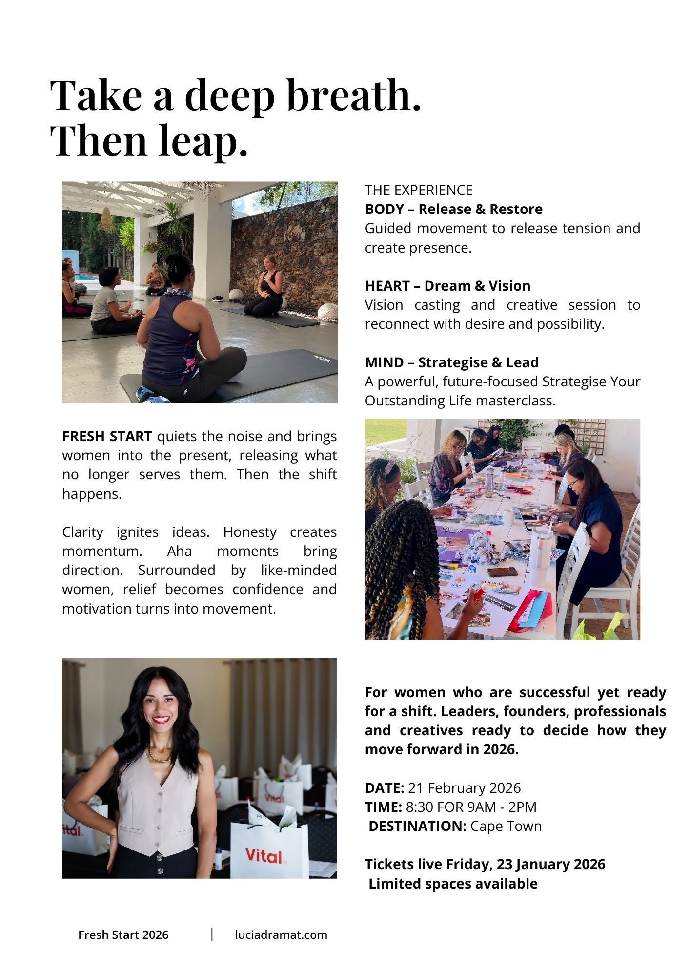 Formerly known as Strategise Your Outstanding Life, Fresh Start 2026 marks the next evolution of an experience that has helped hundreds of women realign their lives, personally and professionally.